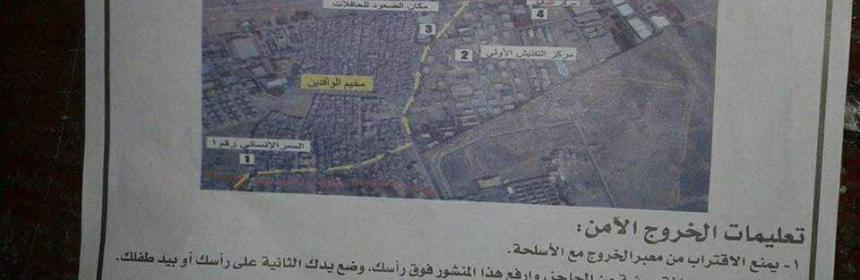 Am 22 Februar haben Helikopter der Syrisch Arabischen Luftwaffe (SyAAF) angeblich Tausende von Flugblätter über Ost-Ghouta abgeworfen, die besagen das die Syrisch Arabische Armee (SAA) die Bevölkerung dazu aufruft, das Gebiet über mehrere sichere Routen zu verlassen, und sie davor warnte das zeitnah eine Militäroperation bevorstehe, darüber berichtete die alternative News-Website Southfront.