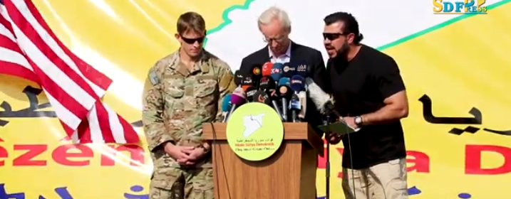 In Anwesenheit von amerikanischen Regierungsvertretern ließen sich SDF-Führungspersönlichkeiten während ihrer fadenscheinigen Siegeserklärung dazu hinreißen, von der syrischen Regierung zu fordern ihre selbst proklamierte „Autorität“ anzuerkennen. In der Erklärung heißt es wie folgt: