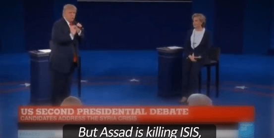 Während einer 2016 stattgefundenen im US-Fernsehen ausgestrahlten Wahlkampfdebatte zwischen Hillary Clinton und Donald Trump, ließ Letzterer tatsächlich verlauten das der syrische Präsident Bashir al-Assad zwar nicht nach seinem Gusto sei, er dennoch die ISIS „tötet“. „Russland tötet die ISIS und der Iran tötet die ISIS,“ so Trump gegenüber Clinton und der Audienz.