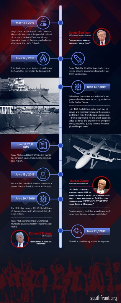 Amerikanische Regime-Change Ambitionen haben den Persischen Golf in ein Minenfeld verwandelt. Die Entsendung von Flottenverbänden in eines der weltweit engsten Gewässer wo man sich nahezu gegenseitig auf die Füße tritt und damit einhergehende urplötzlich auftretende Sabotageakte und Terror-Anschläge, sind keine zufällig synchron ablaufenden Entwicklungen, denn sie sind das Werk eines Urhebers. Eine von dem alternativen online-Portal Southfront erstellte Grafik, veranschaulicht wie die Situation sich innerhalb von nur einem Monat chronologisch verschärfte.