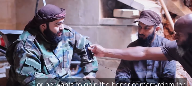Muhaysinis mutmaßlicher sexueller Partner, Moslih al-Yani, rekapituliert die Worte des Dorfältesten, und unterstreicht das es unabdinglich sei an dem Jihad zu partizipieren, auch wenn man als Kampfunfähiger nur die Wäsche der Mudschaheddin wäscht, irgendetwas müsse erfolgen. Dies aus dem Munde eines derartig degenerierten schwächlichen Wesens zu hören, grenzt an Wahnsinn. Der zwergenhafte al-Yani und sein devotes Erscheinungsbild, muten an das er der feminine Teil in der wechselseitigen Beziehung mit Muhaysini ist. Letzterer schlussfolgert auf Kareems Frage hin, ob man sich darauf gefasst machen müsse wieder unter Assad leben zu müssen, das in Syrien kein Bürgerkrieg stattfände, sondern der Jihad kontinuiert würde auf dem die „syrische Revolution“ fuße, jene fortgesetzt würde und sich gegen einen „Tyrannen“ und gegen „Schiiten „richte, die erwägten einen demographischen Wandel durchzuführen, so Muhaysini. „Okkupanten“ und „Invasoren“ gerieten ebenfalls ins Visier der „Revolution“. „Es handelt sich nicht um einen Bürgerkrieg“, betont der Terror-Fürst laut und deutlich. In dieser Hinsicht schuldet man dem Terroristen einfach nur Dank. Begräbt er doch mit Offenkundigkeit, fortwährend das westliche Narrativ vom „syrischen Bürgerkrieg“. Für einen Augenblick spricht Muhaysini gar die Wahrheit, als er davon spricht das die Al-Qaida Allianz ständig zu hören bekäme, das sie lediglich „Dominosteine“ seien die „nach der Pfeife von ausländischen Mächten tanzten“. Dies entspräche nicht der Wahrheit, so Muhaysini. Das Gegenteil ist der Fall.