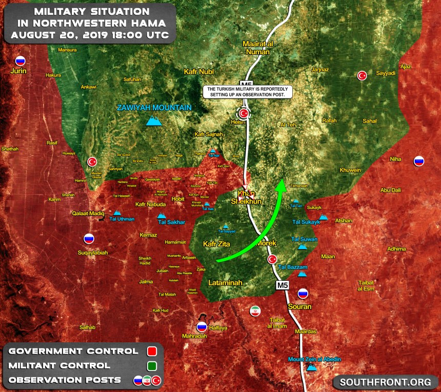 „Dieser abgewendete Vorfall ereignete sich kurz nachdem die Syrisch Arabische Armee den türkischen Konvoi in Idlib unter Beschuss genommen hatte. Die Türkei behauptet das dabei 3 Zivilisten getötet, und 12 weitere verwundet worden seien. Ferner sagte Ankara das der Konvoi lebensnotwendige humanitäre Güter zu dem Beobachtungsposten Nr.9 transportiert hätte, und entsendet worden sei um Versorgungslinien offen zu halten und zivile Opfer in der Region zu verhindern. Die erwähnten „humanitären Lieferungen“ umfassten etwa 28 Militärfahrzeuge, einschließlich 7 Kampfpanzer, und bewegten sich in Richtung der moderaten Rebellen ( Al-Qaida nahe Militante) , jene in den vergangenen Tagen und Wochen gegen die Syrische Armee schwere Verluste hinnehmen mussten.“