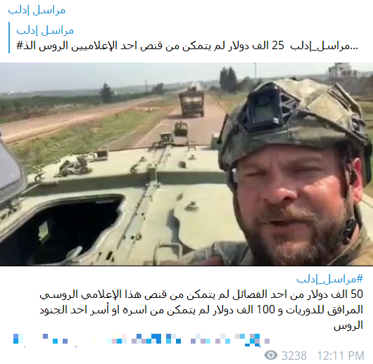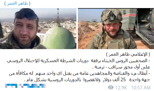 Das mit der HTS affiliierte und von westlichen Journalisten gepriesene Propagandaorgan ,Tahir al Omar, hat kürzlich auf seinem Telegramm-Kanal ein Kopfgeld auf zwei russische Journalisten ausgesetzt, welche die russisch-türkischen Patrouillen auf dem M-4-Highway begleiten.
