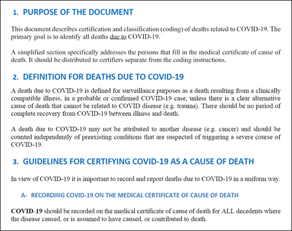 „Es ist wichtig zu betonen, dass die Corona-Krankheit 19 oder Covid-19 für alle Verstorbenen gemeldet werden sollte, bei denen die Krankheit den Tod verursacht, vermutlich verursacht, oder dazu beigetragen hat.“