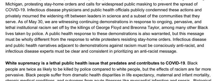 Mit groteskem Wortlaut heißt es weiter: “ Als Advokaten der öffentlichen Gesundheit, verurteilen wir diese Versammlungen nicht als riskant für die Übertragung von COVID-19.“ Und hinzufügend : „Wir unterstützen sie. Denn sie sind lebenswichtig für die öffentliche Gesundheit, und die bedrohte Gesundheit. Insbesondere für die der schwarzen Bevölkerung in den USA.“
