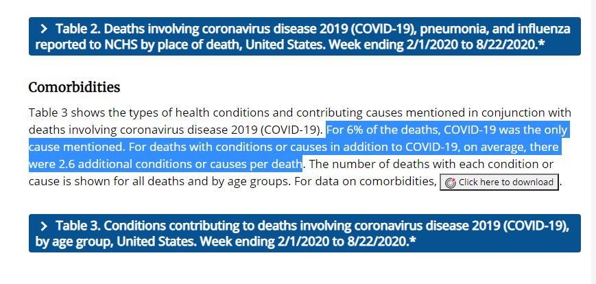 In dem jüngsten CDC-Update bezüglich der „Pandemie-Entwicklungen“ heißt es, dass bei lediglich 6% der vermeintlichen Corona-Toten in den USA, Covid-19 als explizite Todesursache festgestellt werden konnte. Also bedeutet dies, dass die unermüdlich von Leitmedien herausgegebene Sterberate, spätestens jetzt keine veritable Aussagekraft mehr aufweist. Abgesehen davon das den manipulierten Corona-Statistiken, ohnehin keine Glaubwürdigkeit beigemessen werden kann.