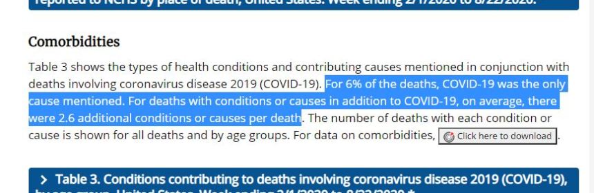 In dem jüngsten CDC-Update bezüglich der „Pandemie-Entwicklungen“ heißt es, dass bei lediglich 6% der vermeintlichen Corona-Toten in den USA, Covid-19 als explizite Todesursache festgestellt werden konnte. Also bedeutet dies, dass die unermüdlich von Leitmedien herausgegebene Sterberate, spätestens jetzt keine veritable Aussagekraft mehr aufweist. Abgesehen davon das den manipulierten Corona-Statistiken, ohnehin keine Glaubwürdigkeit beigemessen werden kann.