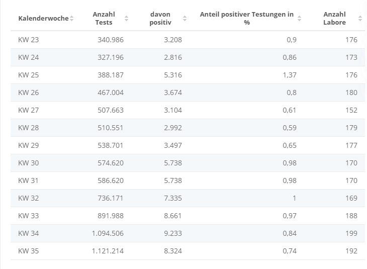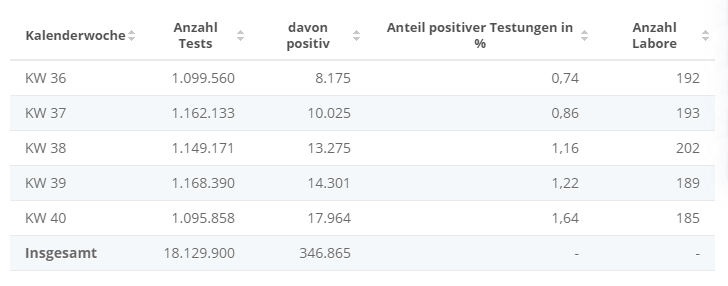 Diese einstigen Kassandrarufe sind augenblicklich im Winde verhallt und wir testen inzwischen allwöchentlich an die 1,2 Millionen Menschen. Deutschland hat nach aktuellen Statistiken bis zum 9.Oktober, 18 129 900 Corona Tests durchgeführt. Dabei will man 319 381 positive Befunde registriert haben. Oder 1.76% von allen durchgeführten Tests. Wie Jens Spahn unmissverständlich zu Protokoll gegeben hat, ist kein Test zu hundertprozentig wasserdicht. Sprich Fehlerquoten sind unvermeidbar. Im Falle der Polymerasen Kettenreaktion( PCR) schwanken die Angaben zu Falschpositiv- Raten von 1- 3, manche Sachverständige sprechen gar von 5-8%. Was mitunter von den PCR-Amplifikationszyklen, der Qualität der Tests und Laborarbeiten abhängt. Überstrapazierte Labors tendieren dazu schluderig zu werden. Wodurch sich die Possibilitäten für Kontaminationen vervielfältigen. Demzufolge könnten alle bislang registrierten Covid-19 Infektionen, der Falsch-Positiv-Rate unterliegen. Es mutet stark an, dass es sich genauso verhält. Es ist hinreichend die Anzahl durchgeführter Tests, aufgesplittet in Kalenderwochen und den Anteil positiver Testungen im Verhältnis dazu in Augenschein zu nehmen. Wir bewegen uns seit Monaten exakt im Rahmen der Falsch-Positiv-Rate.