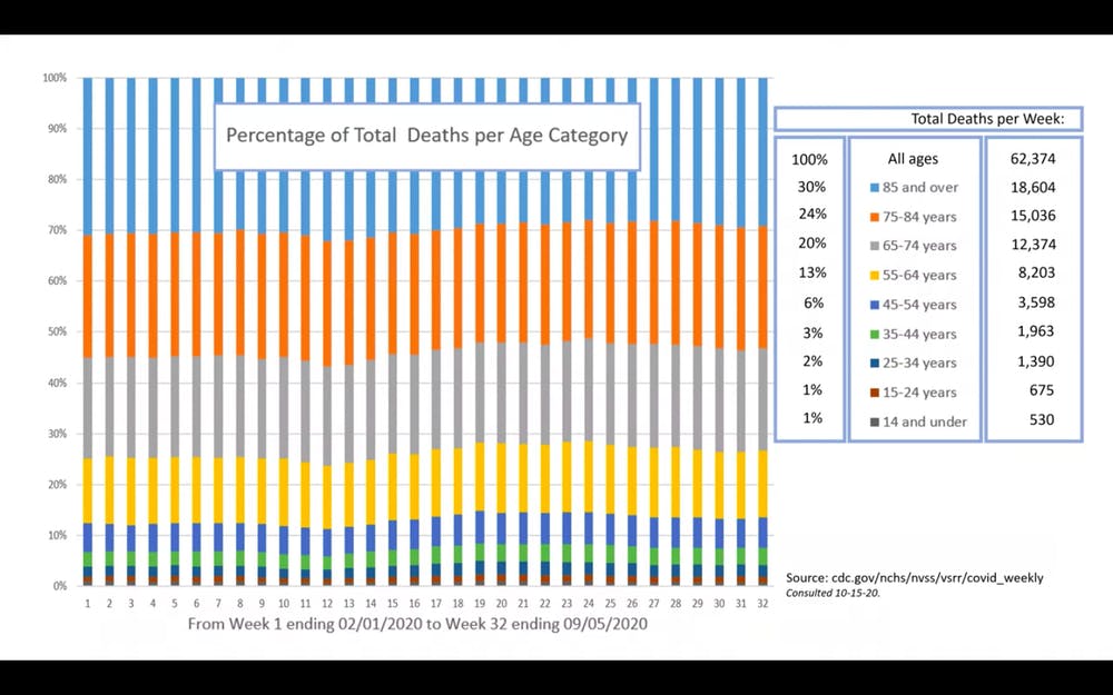 „Überraschenderweise sind die Sterbefälle betagter Menschen vor und nach Covid-19 gleichgeblieben. Da vorwiegend Betagte von Covid-19 betroffen sind, haben Experten einen prozentuellen Anstieg in der Sterblichkeit betagter Altersgruppen erwartet. Doch dieser Anstieg geht nicht aus den CDC-Daten hervor. Genaugenommen ist die prozentuelle Sterblichkeit aller Altersgruppen vergleichsweise gleichgeblieben.“