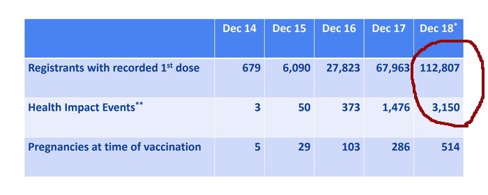 Bis zum 18.Dez sind 3150 geimpfte Personen mit wie die CDC es bezeichnet „Health Impact-Events (Gesundheit beeinträchtigende Vorfälle)“ registriert worden, . Die Bezeichnung „Health Impact-Events“ wird wie folgt definiert: „Arbeitsunfähig, unfähig täglichen Aktivitäten nachzugehen, erforderliche Behandlung von Arzt oder medizinischen Fachpersonal.“