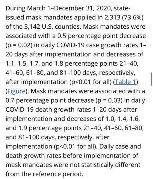Erst neulich hat die CDC bekanntgegeben, dass Gesichtsmasken kein signifikantes Vermögen aufwiesen um der Covid-Wachstumsrate Herr zu werden. Genau genommen sollen die Corona-Nikabs vom 1.März -31.Dezember 2020, nach den ersten 20 Tagen, die Wachstumsraten in den USA um mickrige 0,5% nach unten gedrückt haben. Nach 100 Tagen habe sich dieser Wert auf läppische 1,8% belaufen, so die CDC.