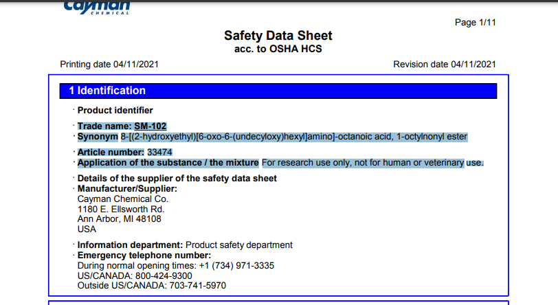Auf einem alternativen Medienportal sind wir auf ein Sicherheitsdatenblatt, der im US-Bundesstaat Michigan ansässigen Chemiefabrik, Cayman Chemical Company, gestoßen. Auf dem Safety Data Sheet acc. to OSHA HCS.” (04/11/2021) [2] werden die Effekte und Toxizitäts-Einstufung von SM-102 aufgelistet. Einleitend wird der ausschließliche Verwendungszweck wie folgt erörtert: „Nur für Forschungszwecke, nicht für die humane und veterinäre Anwendung geeignet.“