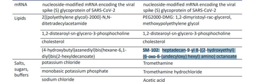 Neben der noch nie zuvor für die Anwendung am Menschen zugelassenen mRNA-Technologie und dem unerforschten Gefahrenpotenzial der Spike-Proteine, werden mit zunehmender Zeit immer mehr besorgniserregende Ingredienzien, von alarmierten Wissenschaftlern aufgeschlüsselt. Wie etwa das im Moderna-mrNA-Impstoff enthaltende Lipid SM-102, welches in einem CDC-Dokument wie folgt angegeben wird: