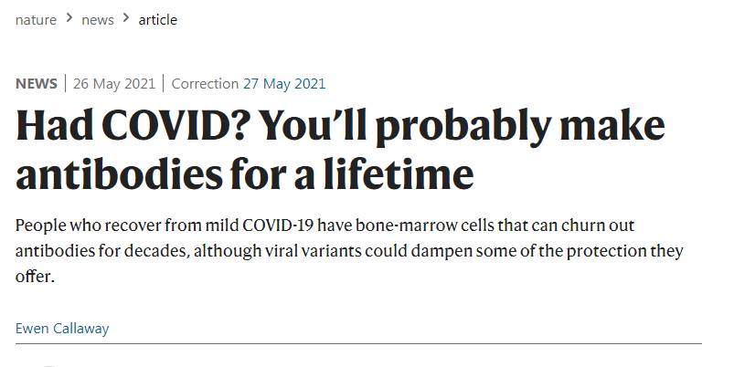 In Anbetracht dieser erschlagenden Beratungsresistenz können darauf wetten abgeschlossen werden, dass den jüngst im renommierten medizinischen Fachmagazin Nature publizierten konklusiven Studienergebnissen, mit dem aufschlussreichen Titel „Had COVID? You’ll probably make antibodies for a lifetime (Hatten Sie Covid? Dann werden sie wahrscheinlich lebenslang Antikörper erzeugen. ), ebenso keine Beachtung geschenkt werden. Insbesondere weil diese neuen Entwicklungen, den Herdenimmuninäts-Pfusch der WHO desavouieren und die postulierte Notwendigkeit der Impfung in Frage stellen.