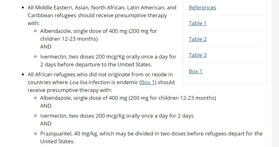 Kein geringerer als die US-Gesundheitsbehörde CDC hat die zurückgebliebene Social-Media Phalanx entlarvt. Ivermectin wird sehr wohl in der Humanmedizin eingesetzt, wie aus einem Dokument hervorgeht, das obligatorische Behandlungsprotokolle für Flüchtlinge und Einwanderer auflistet. Siehe zweite Zeile von unten.