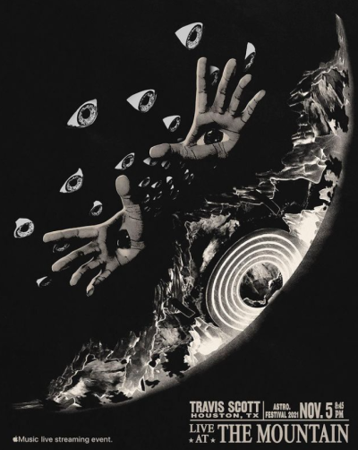 Auf dem Albumcover von Astroworld ist etwa ein riesiger Kopf von Travis Scott abgebildet, dessen lodernder Mund weit geöffnet ist und als Portal dient, in das sich Eltern in Begleitung ihrer Schutzbefohlenen begeben. Um auf ein Astroworld-Festival zu gelangen, müssen sich Gänger durch den Schlund dieser überdimensionalen Gesichtsskulptur begeben.