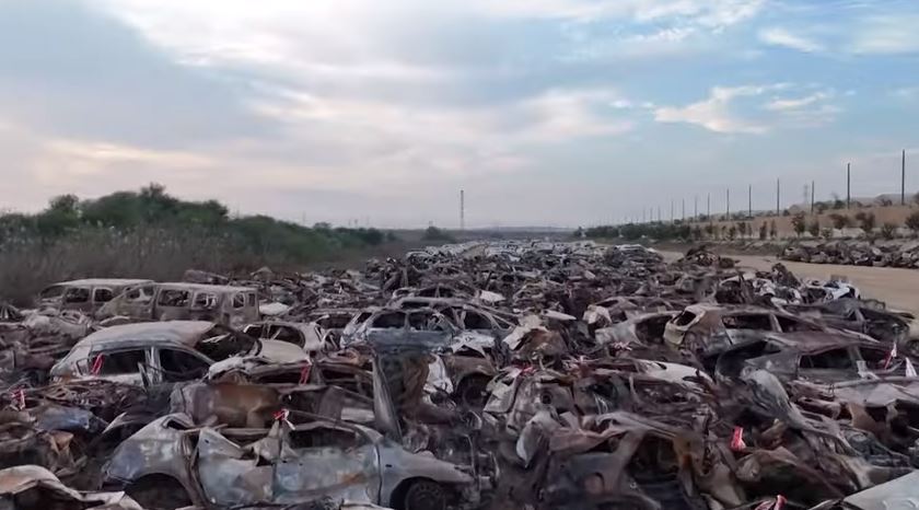 Die förmlich ins Auge springende Merkwürdigkeit sind die dutzenden zum Teil völlig demolierten Fahrzeuge, von denen einige so ausschauen, als wären sie von Raketengeschossen durchsiebt und filetiert worden. Abgesehen davon das bislang keine Videoaufnahme in Umlauf gebracht worden ist, jener zu entnehmen wäre, dass die Hamas-Kämpfer den Fahrzeugfriedhof zu verantworten hätten, stellt sich dennoch die Frage nach dem warum. Weshalb sollte eine winzige paramilitärische Einsatztruppe ihr Material, ihre Zeit und ihre Kraft verschwenden und sich der pyromanischen Beisetzung dutzender Vehikel widmen?