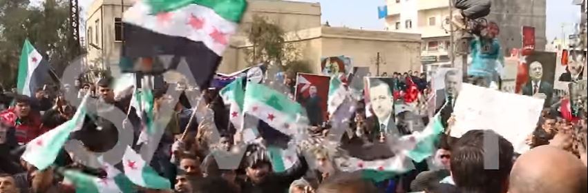 ORBISnjus sagt: Terroristen der Freien Syrischen Armee haben in der besetzten Stadt Azaz in Nord-Aleppo jüngst eine Demonstration veranstaltet, um Solidarität mit der andauernden Türkischen Militäroperation in Afrin kundzutun. Die oppositionelle SMART-Nachrichtenagentur hat kürzlich ein Video der Kundgebung veröffentlicht, das den Anschein erwecken läßt man befinde sich in der Provinz der Türkei. Neben der terroristischen Flagge der FSA wehen Türkische